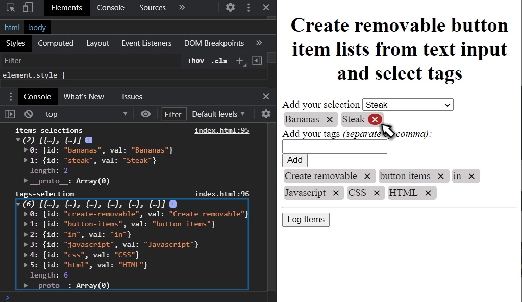 Create Removable Item Buttons Generated From Select Or Comma Separated Input Elements With Html Css And Js Yagisanatode